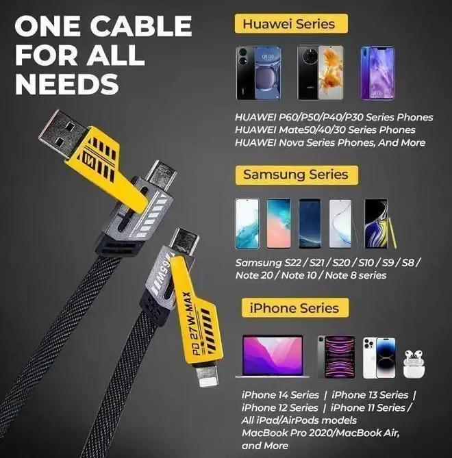 Câble 4 en 1 – Compatible avec un grand nombre de connecteurs pour une polyvalence maximale. Charge rapide de 65 W – Optimisée pour les appareils USB-C et Lightning haute performance. Technologie PD (Power Delivery) – Permet une recharge rapide et efficace de vos smartphones, tablettes et autres appareils portables.