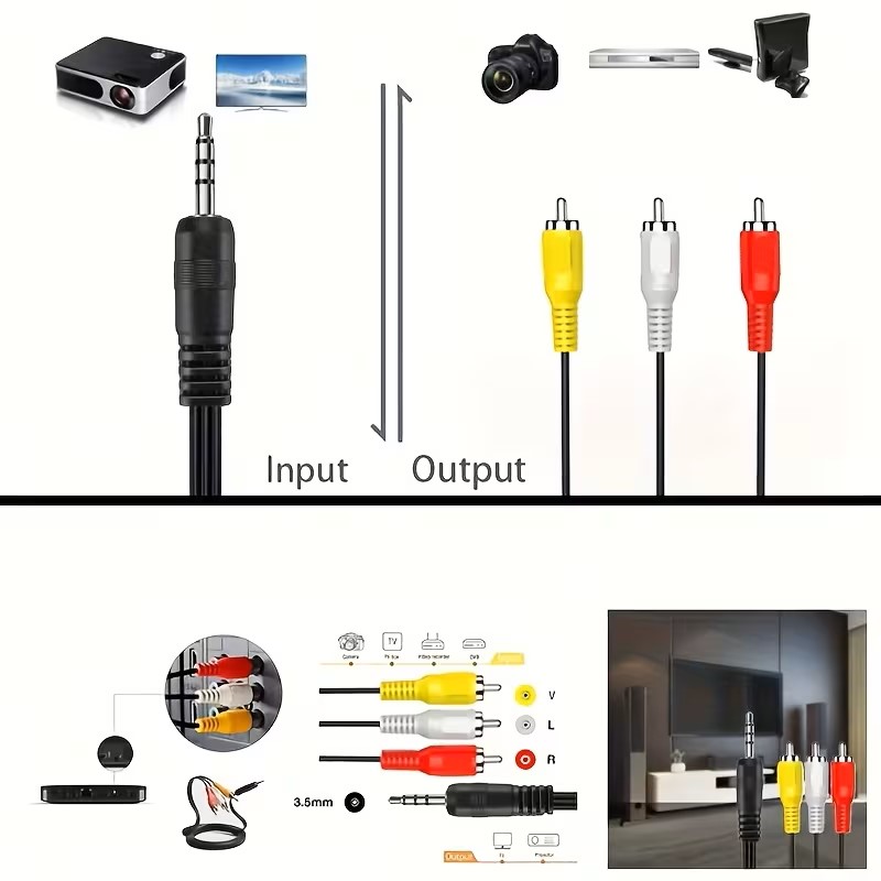 Câble de 1,5 mètre pour connecter une caméra vidéo ou un Handycam avec une sortie audio/vision TRRS 3,5 mm à des appareils tels que des téléviseurs, des smartphones, des lecteurs MP3, des tablettes et des haut-parleurs en utilisant 3 bornes RCA mâles